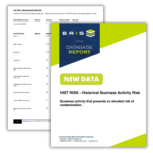 You’ll see it as ‘HIST RISK’ on reports and searches. It is a proprietary list of sites identified as having potentially engaged in business activities that could pose a higher-than-normal contamination risk. These records originate from historical city directories and are included in this list based on broad business categories, such as “potentially hazardous chemical users” and “fuel and automotive,” including but not limited to dry cleaners, fuel stations, garages, and more. Inclusion in this list does not indicate that there is or has been contamination; rather, sites are included because they may have engaged in a business activity that presents an elevated risk of contamination. ERIS compiled the list from various city directories, including BC Directories, Henderson’s, Might’s, Sun Directories, Vernon’s, and Wright’s, spanning from approximately the 1920s through to 1960, depending on the information available by city.
