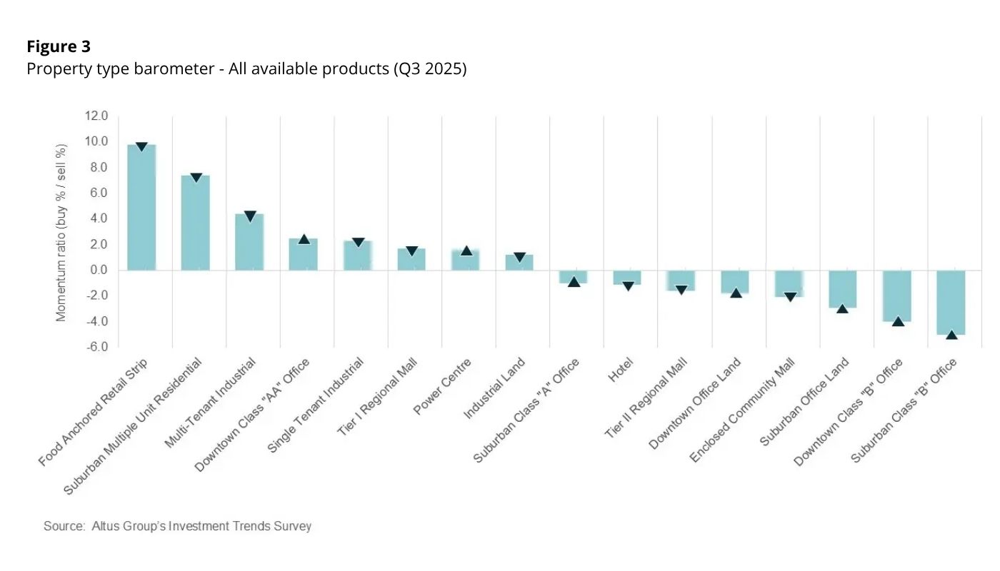 According to Altus Group’s Investment Trend Survey, the Canadian CRE industry in Q3 2025 continued to reflect strong investor interest in stable, lower-risk assets in an uncertain economic environment. The prevailing economic uncertainty, compounded by trade volatility, prompted investors to continue a cautious approach to capital deployment.