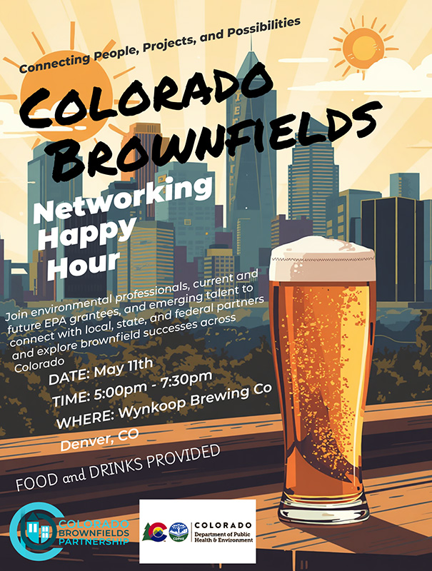 The Colorado Brownfields Partnership is hosting a regional networking happy hour on the evening of May 11, 2026, immediately following the EPA Region 8 Brownfields Grantee Meeting at the EPA office in downtown Denver. The event runs 5:00–7:30 PM at Wynkoop Brewing Co.