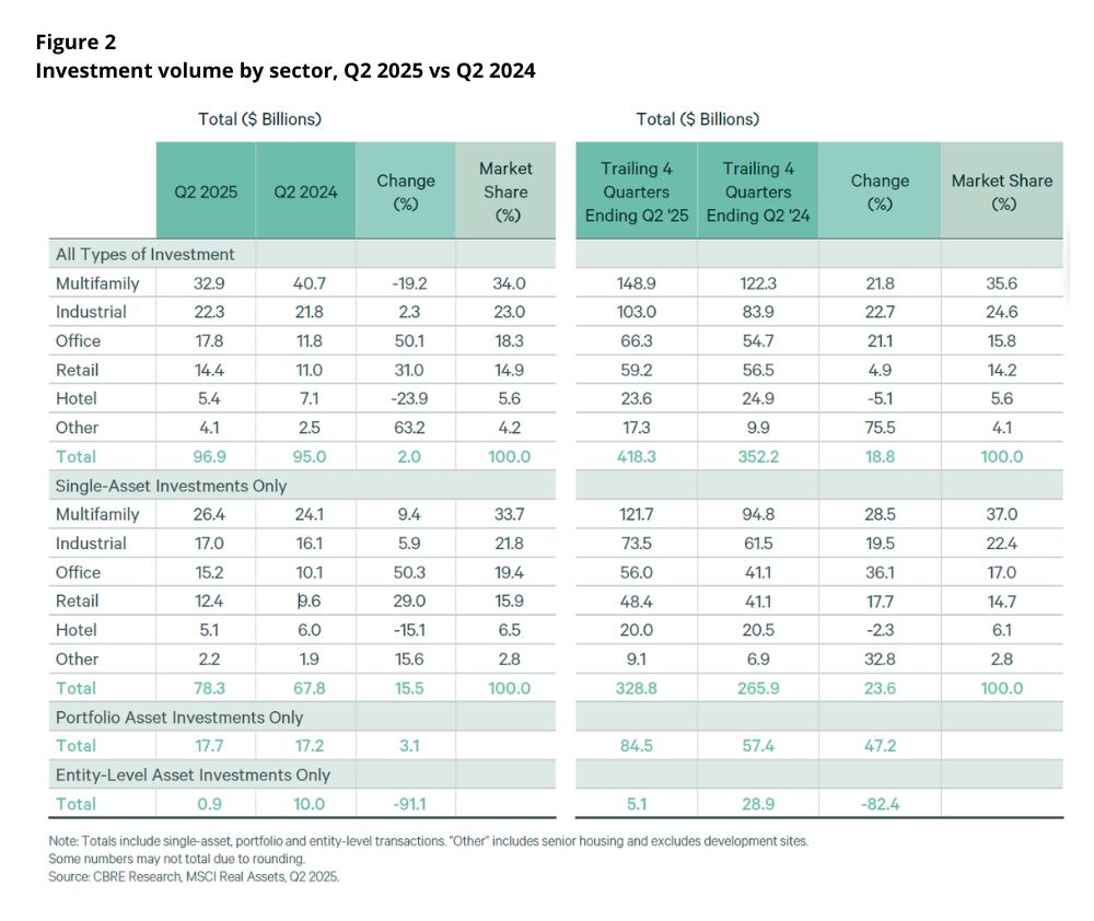 According to CBRE Research, in Q2, commercial real estate investment volume increased by 13% year-over-year to $96 billion. Single-asset sales grew by 15% year-over-year, reaching $78 billion, while portfolio sales increased by 3% to $18 billion (Fig. 1).