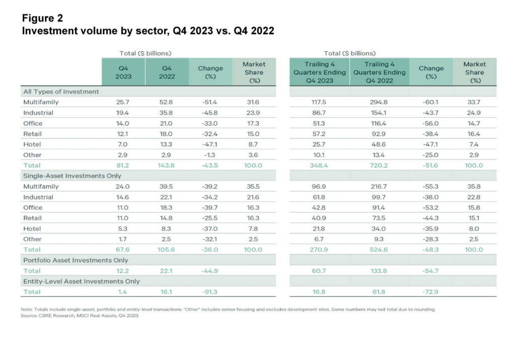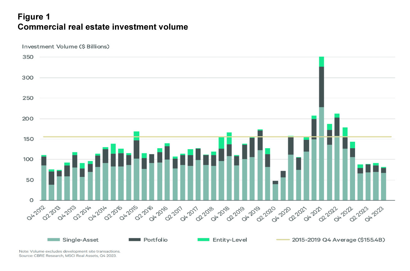 In Q4, U.S. commercial real estate (CRE) saw a substantial 44% year-over-year decrease in investment volume, totaling $81 billion, as reported by CBRE Research. The annual volume plunged by 52% to $348 billion, the lowest since 2012. Notably, entity-level investment volume nosedived by 91% to $14.4 billion in Q4, largely attributed to escalated financing costs. Meanwhile, single-asset sales experienced a 36% decline, reaching $68 billion, while portfolio sales dropped by 45% to $12 billion (see Figure 1).