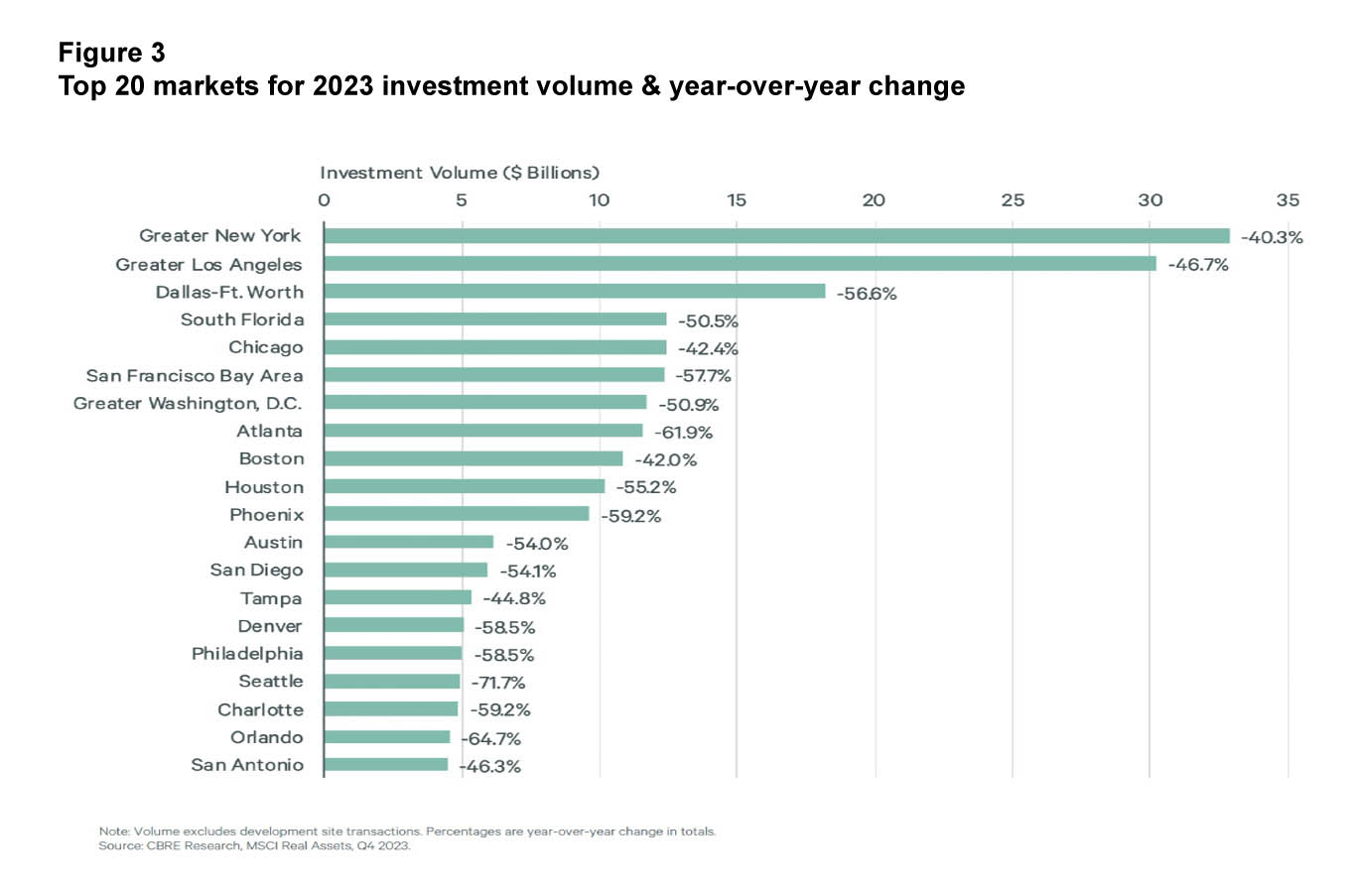 New York led all markets for annual investment volume, securing $33 billion, followed by Los Angeles with $30 billion, and Dallas-Ft. Worth with $18 billion. Among the top 20 markets, New York exhibited the least year-over-year decrease at 40%, with none experiencing an increase (see Figure 3).