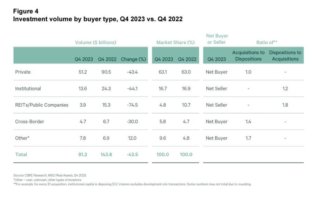 Private investors dominated Q4 investment volume, accounting for 63% of the total, amounting to $51 billion, although this was a decrease of 43% compared to the previous year. Private and cross-border investors remained net buyers, while institutional and REIT investors turned net sellers. REITs/public companies witnessed the most significant year-over-year drop in Q4 investment volume (-75%), followed by institutional investors with a 44% decline. Inbound cross-border investment volume fell by 30% year-over-year in Q4, totaling $4.7 billion. However, on a quarter-over-quarter basis, inbound cross-border volume surged by 36% (see Figure 4).