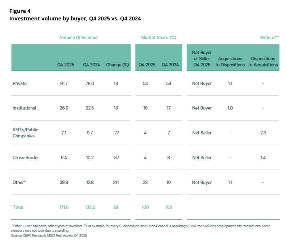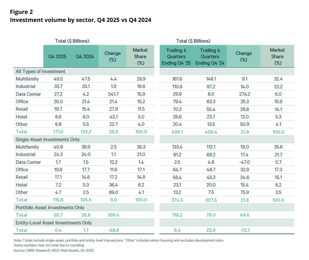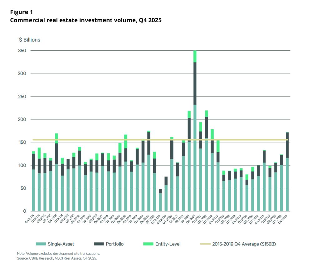 Commercial real estate investment volume increased by 29% year-over-year in Q4 2025 to $172 billion, according to CBRE Research. Annual volume was $499 billion, 22% higher than in 2024.