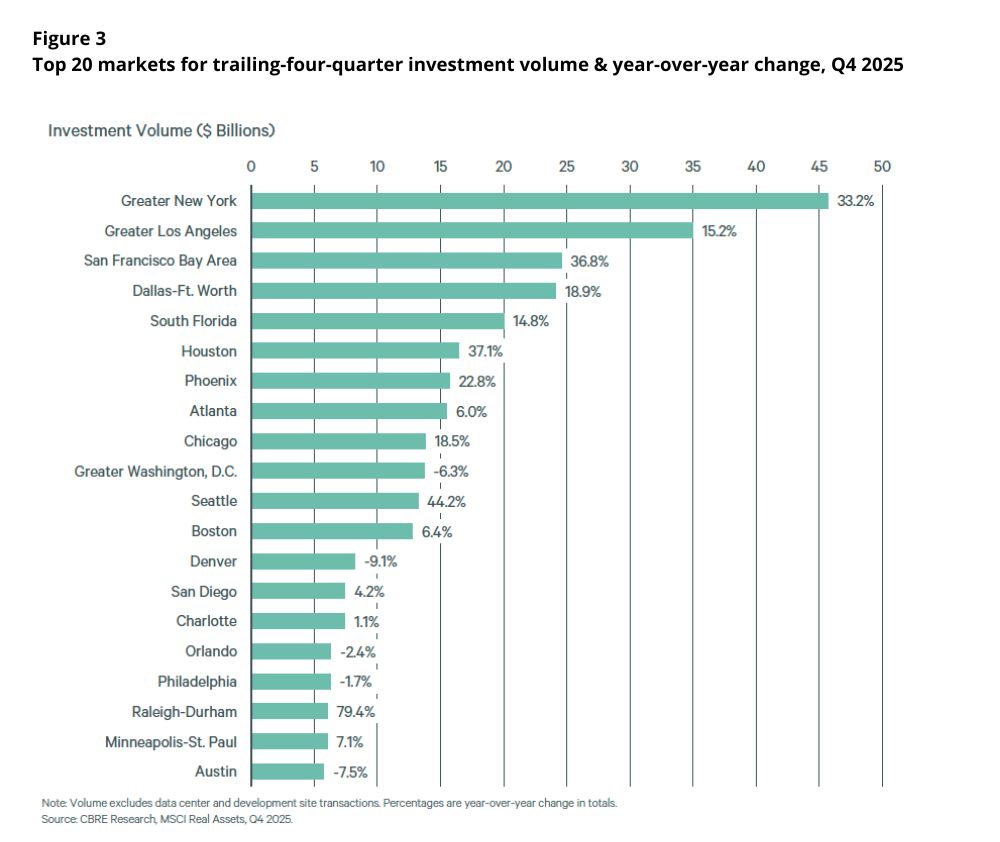 For the prior five quarters ending in Q4 2025, New York was the top market for investment with $46 billion, followed by Los Angeles at $35 billion, and the San Francisco Bay Area at $25 billion. Of the top 20 markets for total annual volume, Raleigh-Durham had the largest year-over-year increase at 79%, followed by Seattle (44%), Houston, and the San Francisco Bay Area (each 37%).