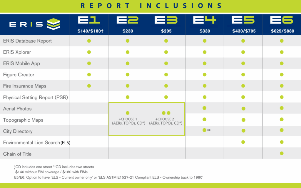 - E5 Includes a Database Report, Xplorer, Mobile App, Figure Creator, Fire Insurance Maps (FIMs), Aerial Photos, Topographic Maps, City Directory (two streets). This package adds an Environmental Lien Search (ELS) – Option to have ‘ELS – Current owner only’ or ‘ELS ASTM E1527-21 Compliant ELS – Ownership back to 1980’.